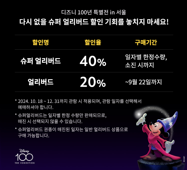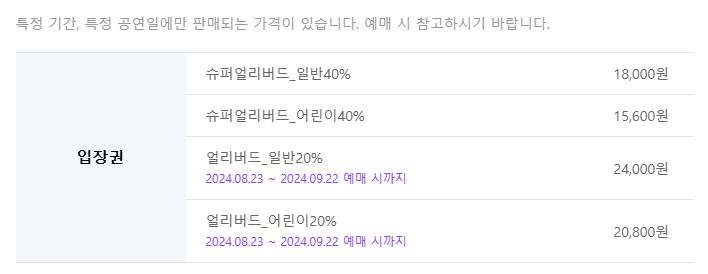 슈퍼얼리버드는 일자별 한정 수량만 판매된다고 합니다. 매진 시 선택되지 않는다고 하니 지금 바로 예매해서 40% 할인이라는 큰 혜택 받으세요.